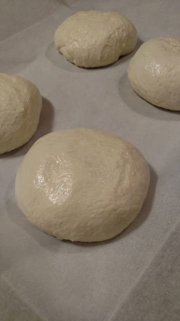 Add the yeast, water, honey and oil to a mixing bowl and stir. Allow this mixture to bloom, about 10 minutes or so. Mix the salt into about 3 to 3/-1/2 cups of flour and add incrementally to the wet mixture, stirring after each addition. Add just enough flour to create a loose dough (this may vary) and turn out onto a pastry cloth that has at least a cup of flour sprinkled on. Bring the dough together with well-floured hands and knead for 8-10 minutes until the dough is elastic, smooth and no longer sticky. Plop into a well oiled bowl and turn to coat all sides. Cover with a dampened kitchen cloth and place in a warm spot to rise. This will take approximately an hour or so. Remove the risen dough to a clean surface, not a floured surface. I used a piece of parchment paper. There is sufficient oil remaining on the dough to handle with no difficulty. Pinch off 4 equal pieces of dough and shape them by turning the dough into itself until you have a smooth surface. Place the portions of dough in a warm place covered by a damp towel and allow about a 30-45 minute rise.